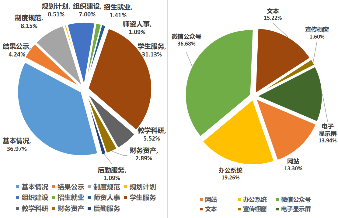 在主動公開的信息中,通過校園網及院外有關機構及部門網站(中直采購網、國家研招網等)方式進行公開的信息290條;通過院內辦公系統方式公開的信息420條;通過文本方式公開的信息332條;通過宣傳櫥窗公開的信息35條;通過電子顯示屏公開的信息304條;通過微信公眾號公開的信息800條。