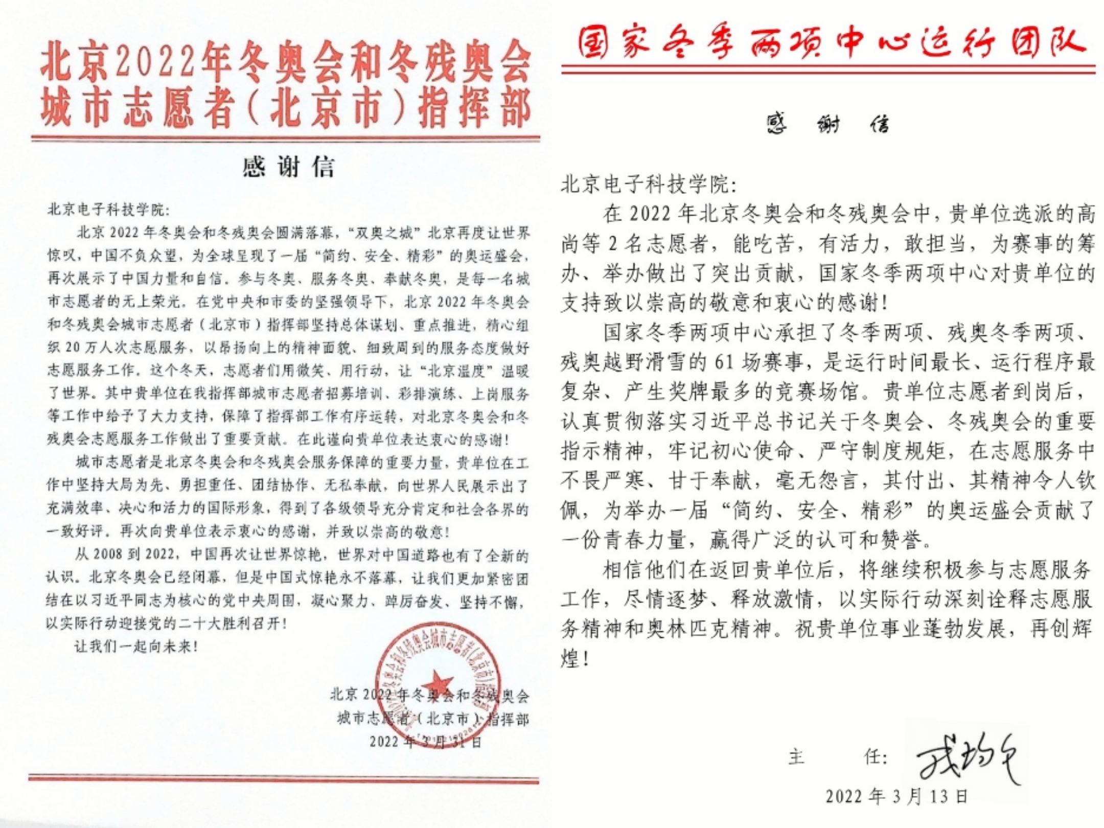 92志愿者犧牲寒假和春節(jié)返鄉(xiāng)過節(jié)的機(jī)會(huì),牢記初心使命踐行志愿精神,在工作中不畏嚴(yán)寒、甘于奉獻(xiàn),在一項(xiàng)項(xiàng)急難險(xiǎn)重的任務(wù)中展現(xiàn)了電科院學(xué)子的青春擔(dān)當(dāng),實(shí)際行動(dòng)為冬奧會(huì)、冬殘奧會(huì)增光添彩。北京2022年冬奧會(huì)和冬殘奧會(huì)城市志愿者(北京市)指揮部、國(guó)家冬季兩項(xiàng)中心和豐臺(tái)、石景山團(tuán)區(qū)委特向?qū)W院致信感謝。