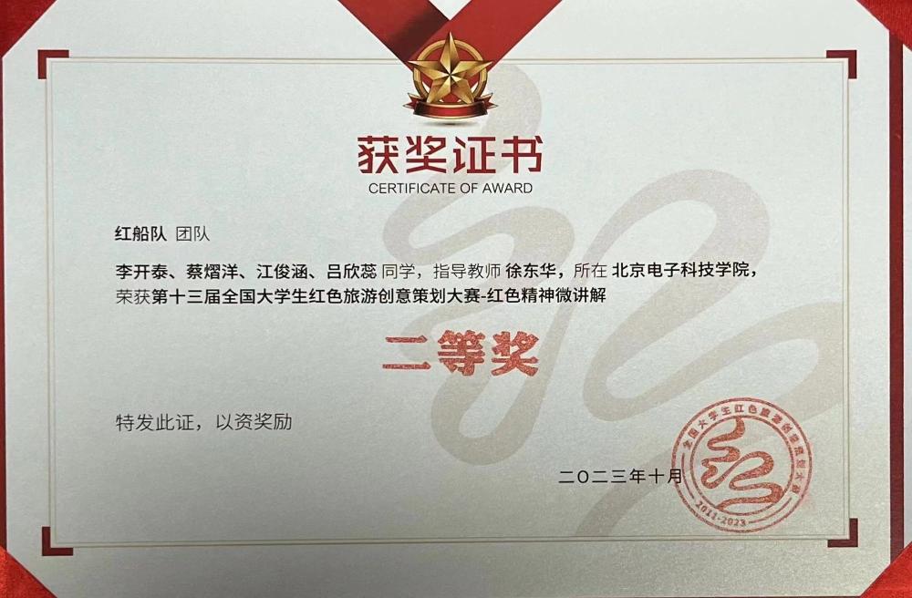 近期,由文化和旅游部主辦的第十三屆全國大學生紅色旅游創意策劃大賽決賽落下帷幕,電科院學生團隊“紅船隊”(團隊成員:李開泰、蔡熠洋、江俊涵、呂欣蕊)榮獲“紅色精神微講解”賽道全國二等獎,指導教師(管理系徐東華)榮獲“最佳指導教師獎”,首次代表學院參賽即獲得全國獎項,取得突破性成績。