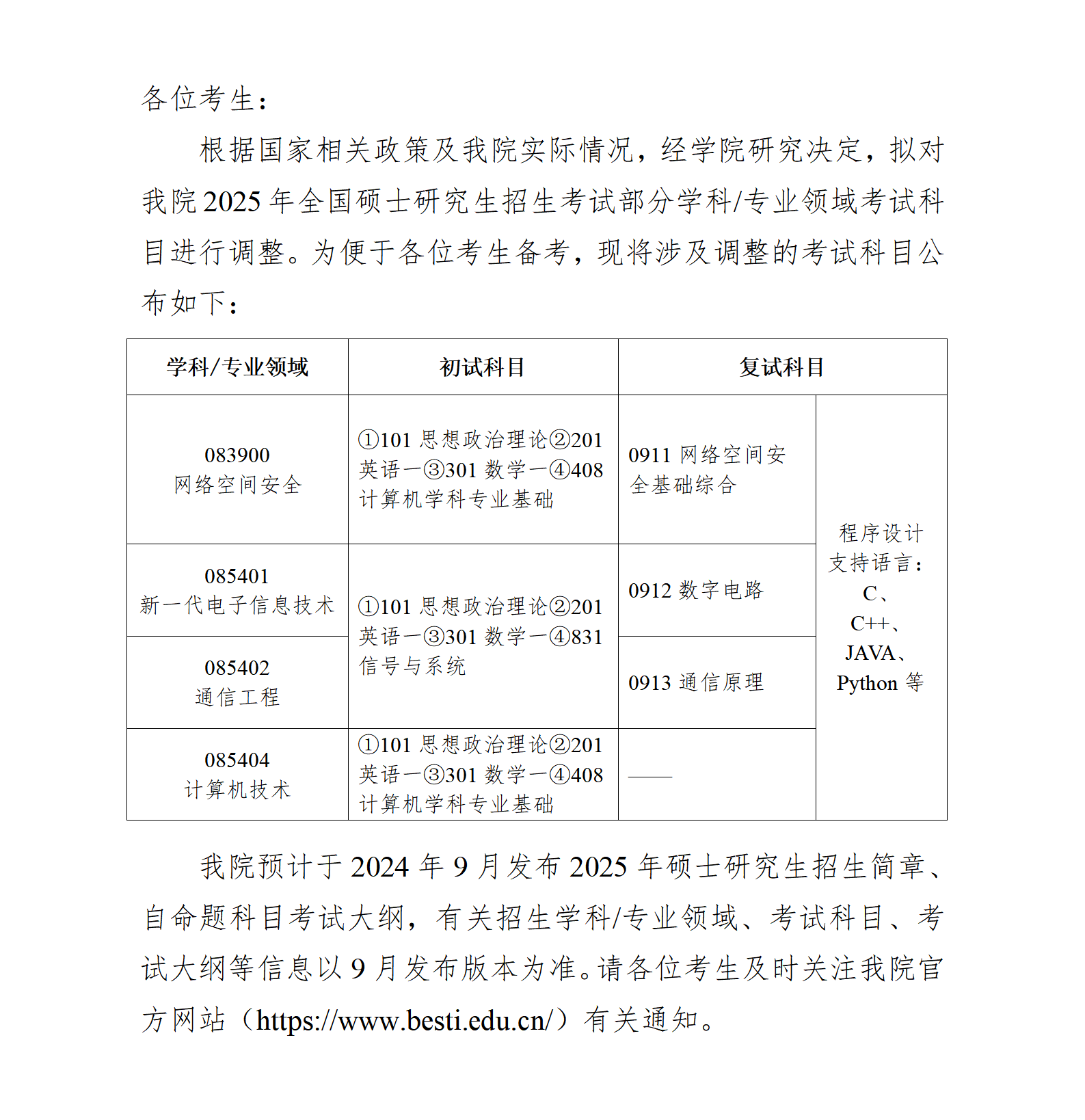 關于調整2025年碩士研究生招生考試科目的通知