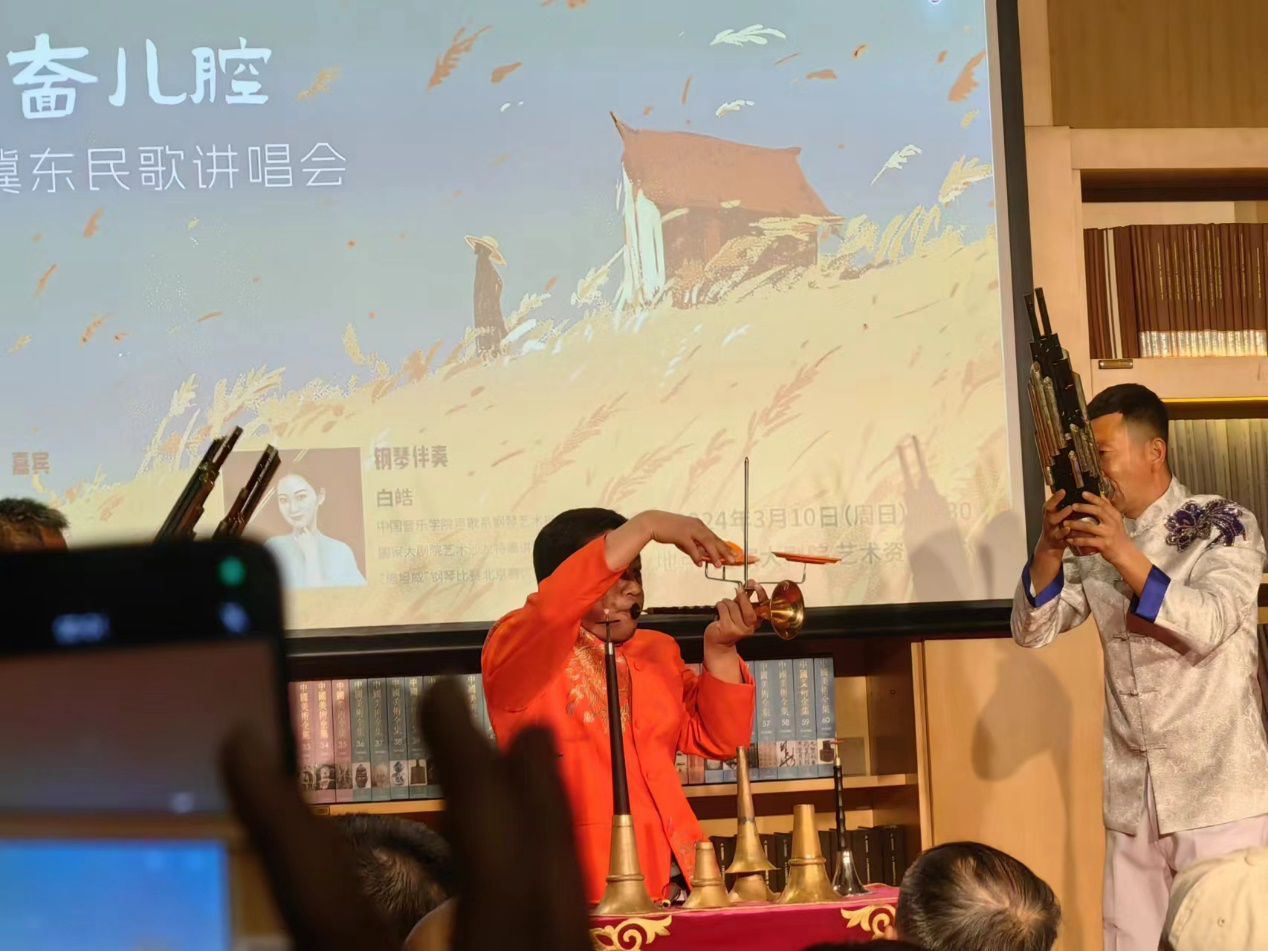 本次講座由中國音樂學院博士生導師張天彤教授主講,河北省級非遺項目“冀東民歌”省級代表性傳承人89歲高齡的劉榮德先生應邀一同講述了冀東民歌的內涵、題材、體裁和采集挖掘背后的故事,唐山市古韻新聲藝術團現場表演展示冀東民歌的風采。