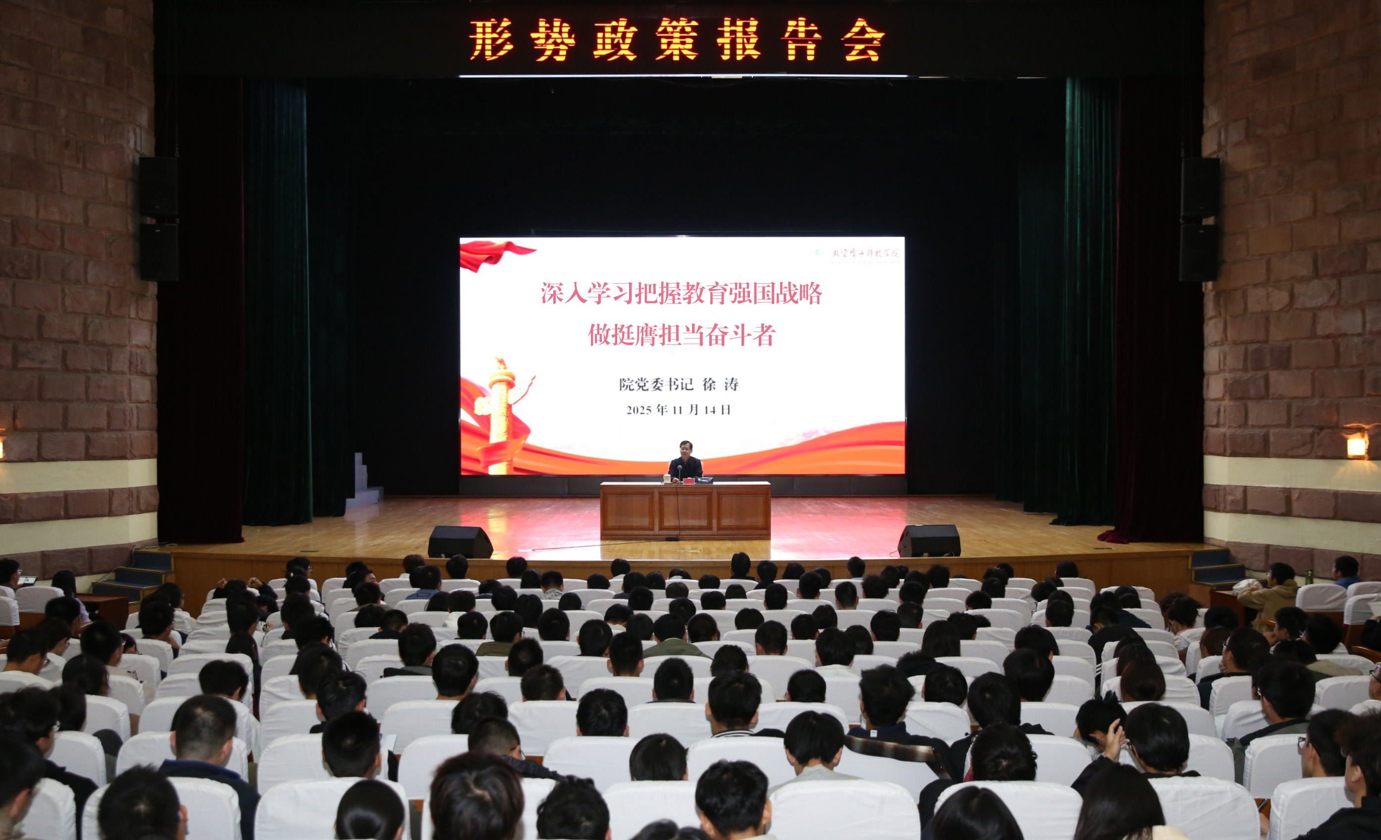 11月14日下午,電科院舉辦形勢政策報告會,院黨委書記徐濤同志作題為“深入學習把握教育強國戰略 做挺膺擔當奮斗者”的報告。學院2000余名學生參加。