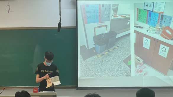 蔡袁新洋同學從抗疫與生態方面開始講起。沙塵暴席卷北京,使我意識到生態的重要性。我們都知道在我國抗疫期間建了火神山雷神山醫院,向世界展現了中國速度,但是你們可能沒有關注過施工過程中的揚塵問題。工地上的大型機械運作時往往會有很大的揚塵,而且此時使用除塵車除塵會在一定程度上影響機械運作。所以從這個角度來看,抗疫對生態確實產生了不利影響,而垃圾分類問題也十分嚴重,在學校經常能看到垃圾桶爆滿現象。于是蔡袁新洋親手示范,將快遞箱拆開,他還是能放進去的,而且拆一下也不費時間。如果每個人都把快遞箱拆開,垃圾桶的空間利用率也會提高,也不至于出現垃圾堆積在地上的情況。垃圾分類是我們每個人自己的責任。