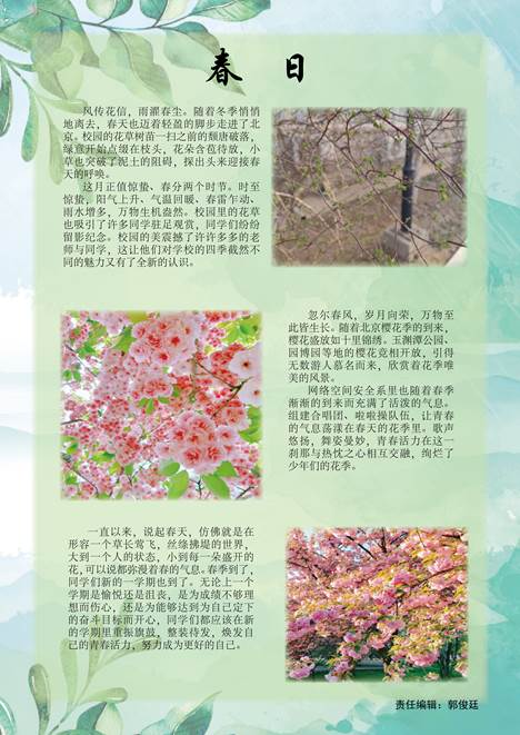 “東園垂柳徑,西堰落花津?!倍潞M,三月風起,新學期的符號,便是溫柔的天氣和慢慢變好的自己。每一個春天,都是大自然新生的順意;每一次新的開始,都是我們留給自己的歡喜。伴隨著新學期的序曲,就讓三月團刊記錄下我們初春的蹤跡和遠方的詩意。
