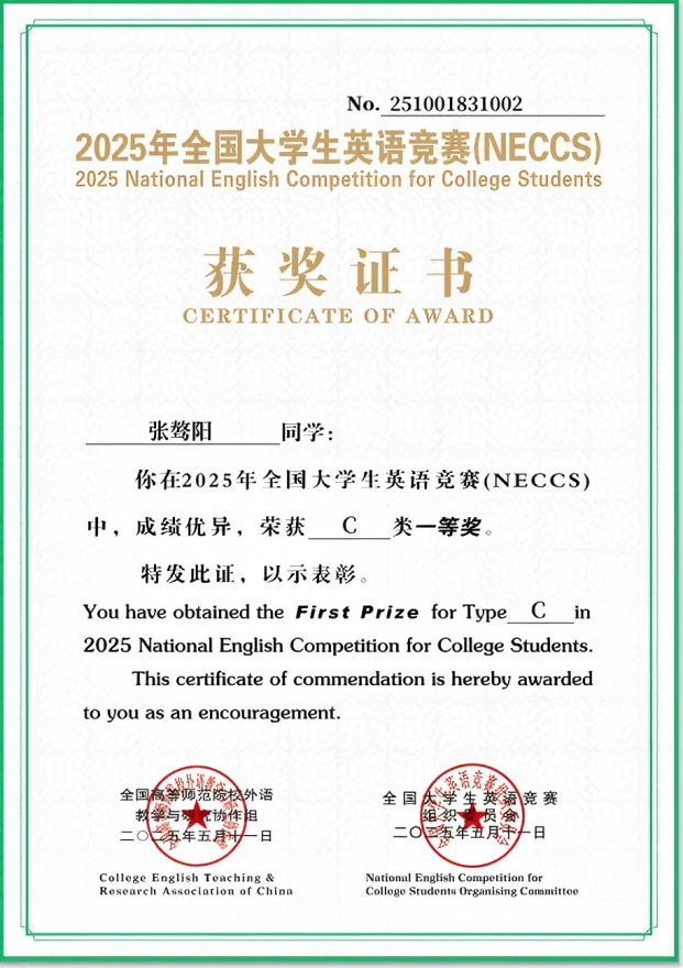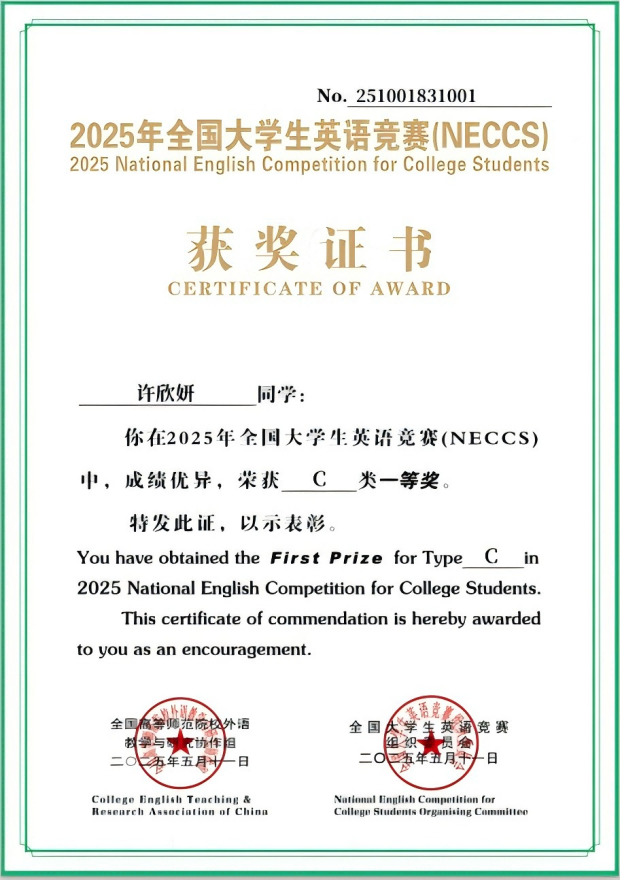 2025年全國大學(xué)生英語競(jìng)賽(NECCS)初賽于2025413日舉行,決賽于511日舉行。本次競(jìng)賽旨在配合教育部高等教育教學(xué)水平評(píng)估工作,貫徹落實(shí)教育部關(guān)于高等院校各類英語教學(xué)改革精神,激發(fā)廣大大學(xué)生學(xué)習(xí)英語的興趣,促進(jìn)大學(xué)生英語水平的全面提高。此項(xiàng)賽事由中國英語外語教師協(xié)會(huì)和高等學(xué)校大學(xué)外語教學(xué)研究會(huì)聯(lián)合主辦,由英語輔導(dǎo)報(bào)社、考試與評(píng)價(jià)雜志社承辦。該賽事是目前國內(nèi)參賽規(guī)模最大、參賽人數(shù)最多的外語類競(jìng)賽。我院共有266名學(xué)生報(bào)名參加此次競(jìng)賽,最終共有23名學(xué)生獲獎(jiǎng),其中2人榮獲一等獎(jiǎng),8人榮獲二等獎(jiǎng),13人榮獲三等獎(jiǎng)。