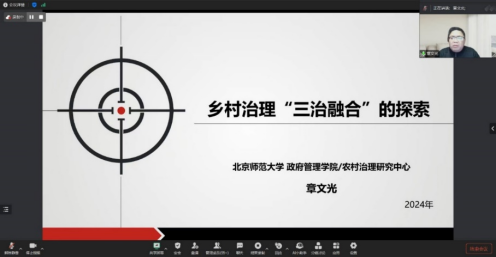 12月26日晚,MPA教育中心邀請全國MPA教指委委員、北京師范大學政府管理學院院長章文光教授通過線上方式為我院師生舉辦題為“鄉村治理‘三治融合’的探索”的講座,我院MPA師生及本科生200余人參加講座。